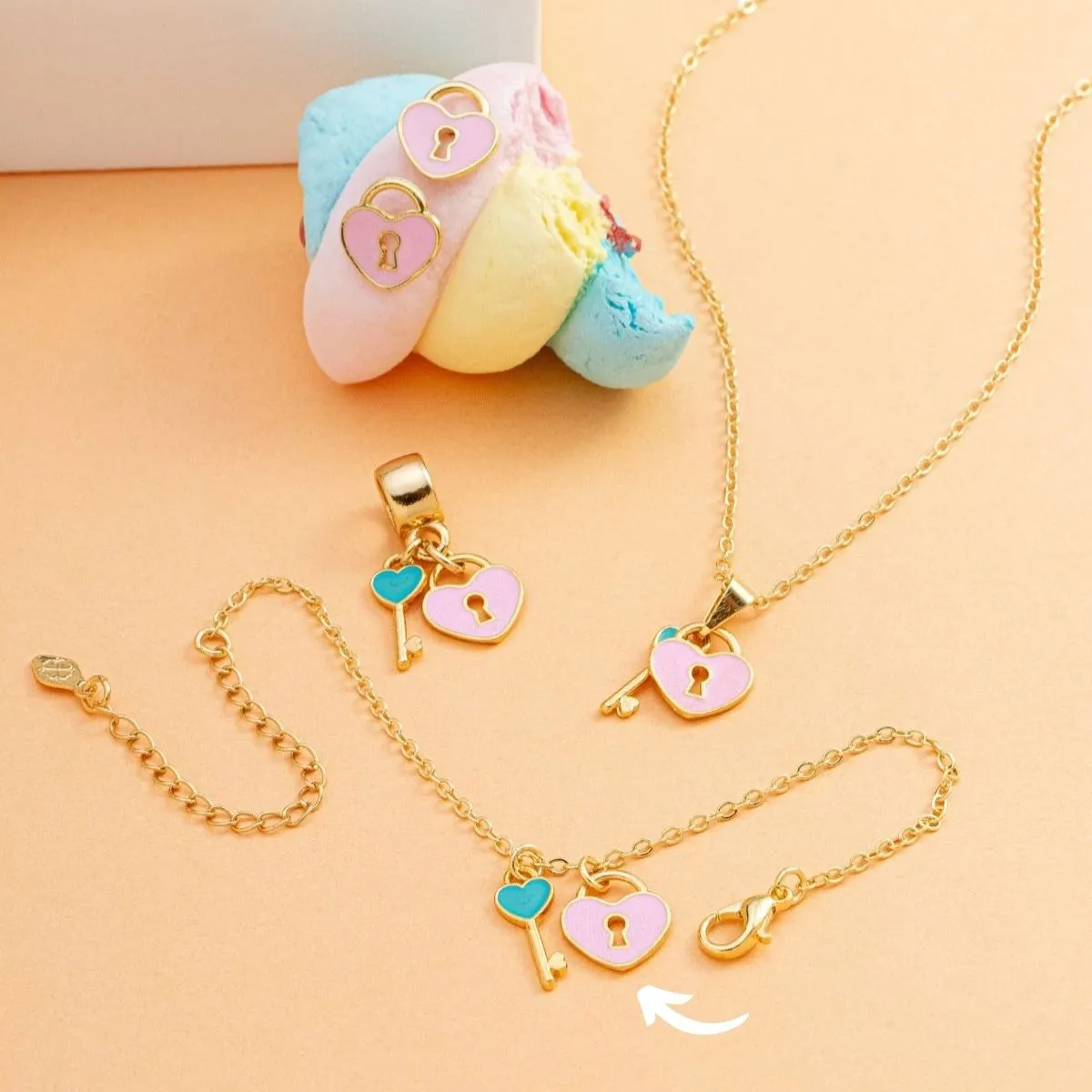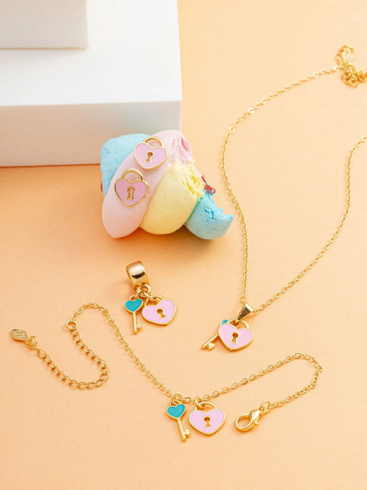 PULSEIRA INFANTIL CORAÇÃO CADEADO E CHAVE ESMALTADO COLORIDO