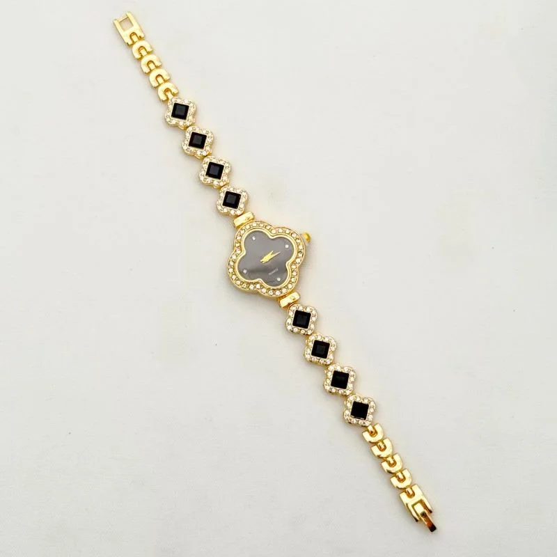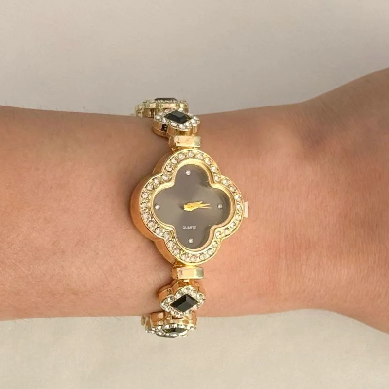 Possui mostrador em formato de trevo, cravejado por zircônias que trazem brilho e delicadeza. A pulseira é composta por pedras quadradas coloridas emolduradas por micro zircônias, resultando em um visual luxuoso e moderno.